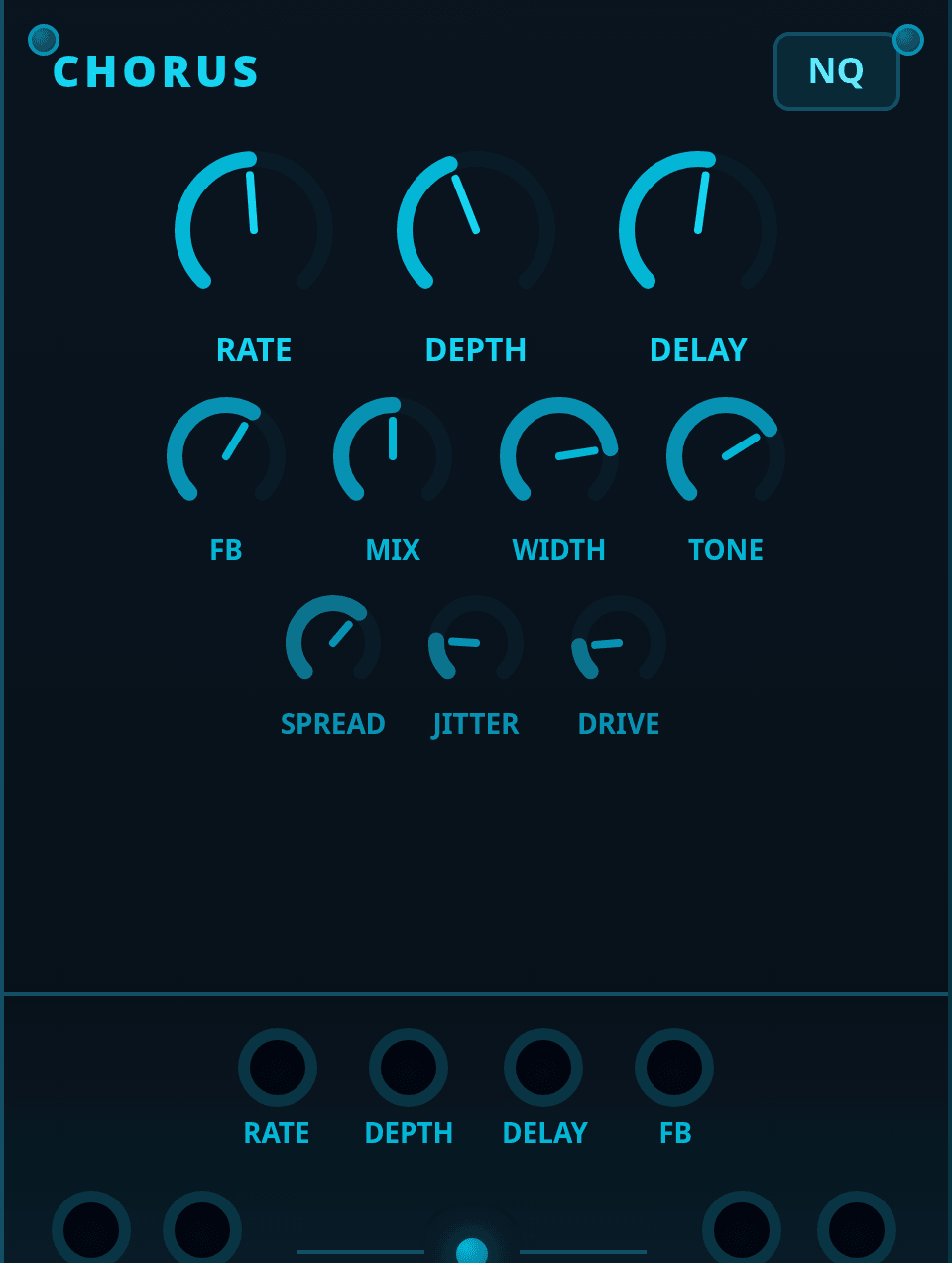 Rate,Depth, andDelaydefine the basic chorus motion.SpreadandWidthdo different jobs:Spreadchanges how separated the moving voices are, whileWidthchanges how much stereo side energy reaches the output.Tonedarkens or brightens the wet signal and also affects the feedback color.Driveadds saturation after the wet signal is bandwidth-limited, so it behaves more like character shaping than simple gain.HQis the smoother, richer option.NQis lighter and more straightforward.