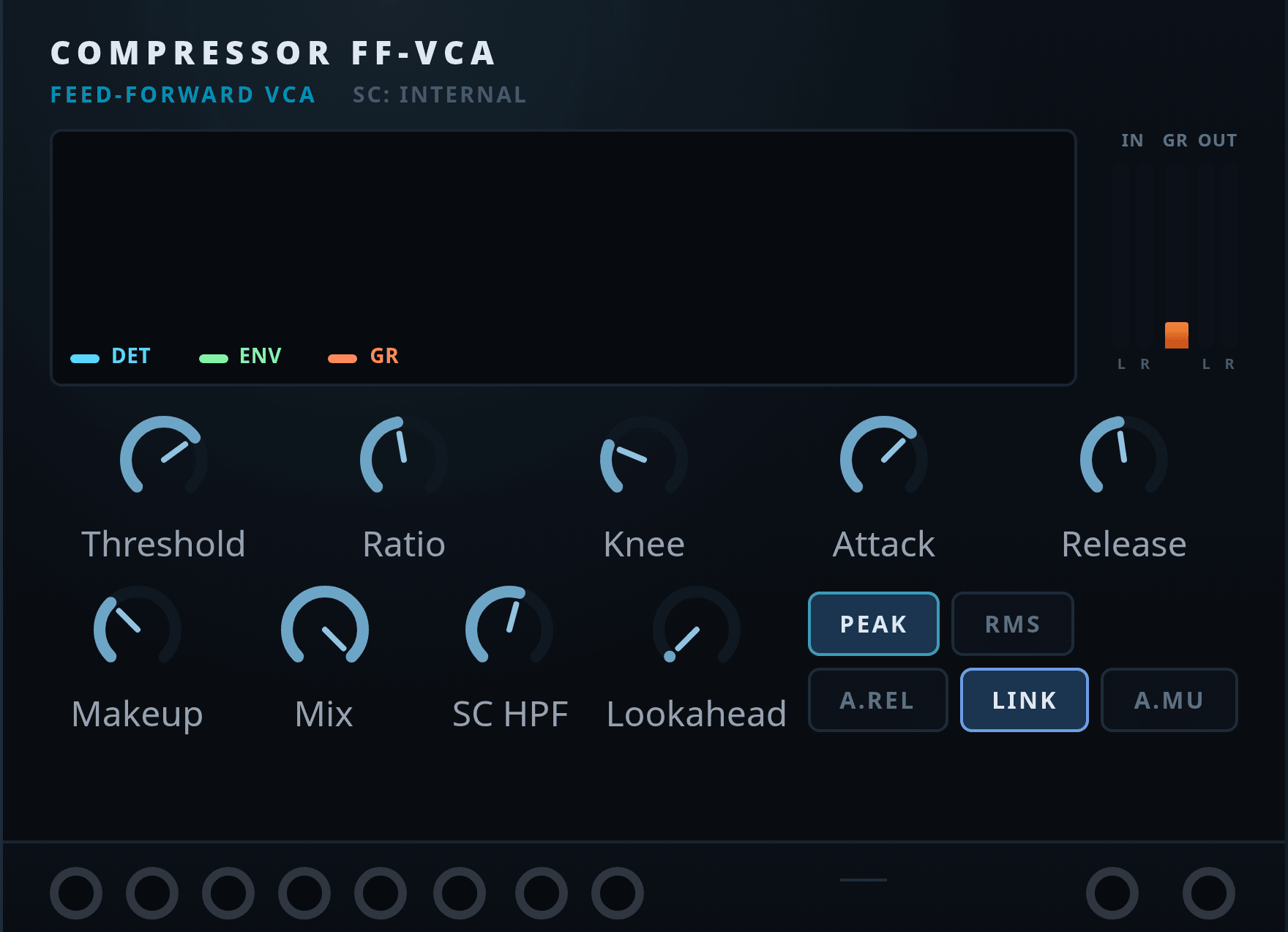 Peakmode reacts faster to transients;RMSmode follows average energy over a short window.Mixblends dry and compressed signal inside the module, so it works as true parallel compression.- The scope section visualizes detector level, envelope movement, and gain reduction in real time.