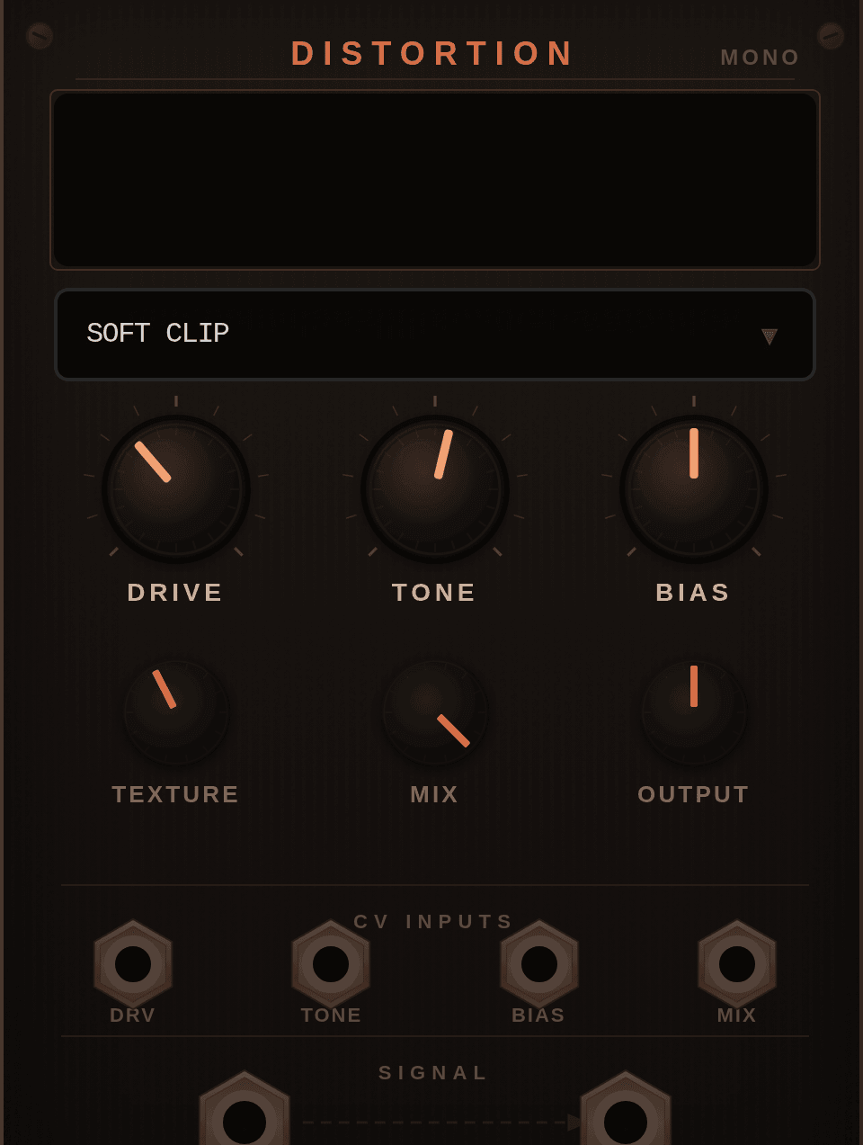 Distortion is a flagship mono drive module with ten shaping modes, dedicated tone and bias control, a texture stage for mode-specific behavior, and CV inputs for the core performance parameters.