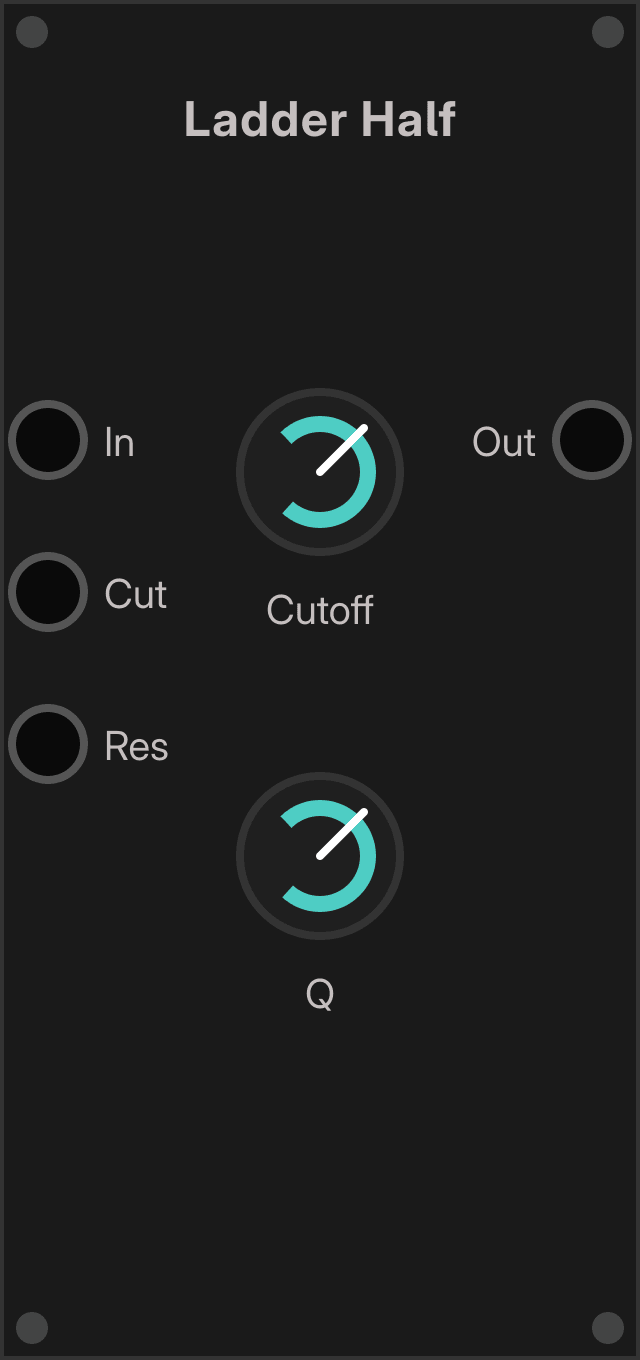 Ladder Halfis a single-input, single-output lowpass filter.- It uses the same basic control set as the full ladder modules: