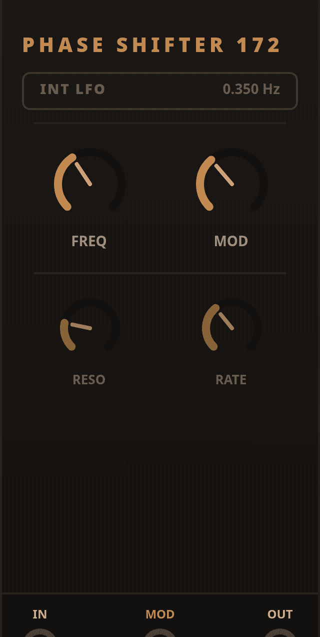 Phase Shifter 172 is a mono, Behringer 172-inspired phaser built from cascaded all-pass stages, with resonance feedback and either an internal LFO or an external CV sweep source.