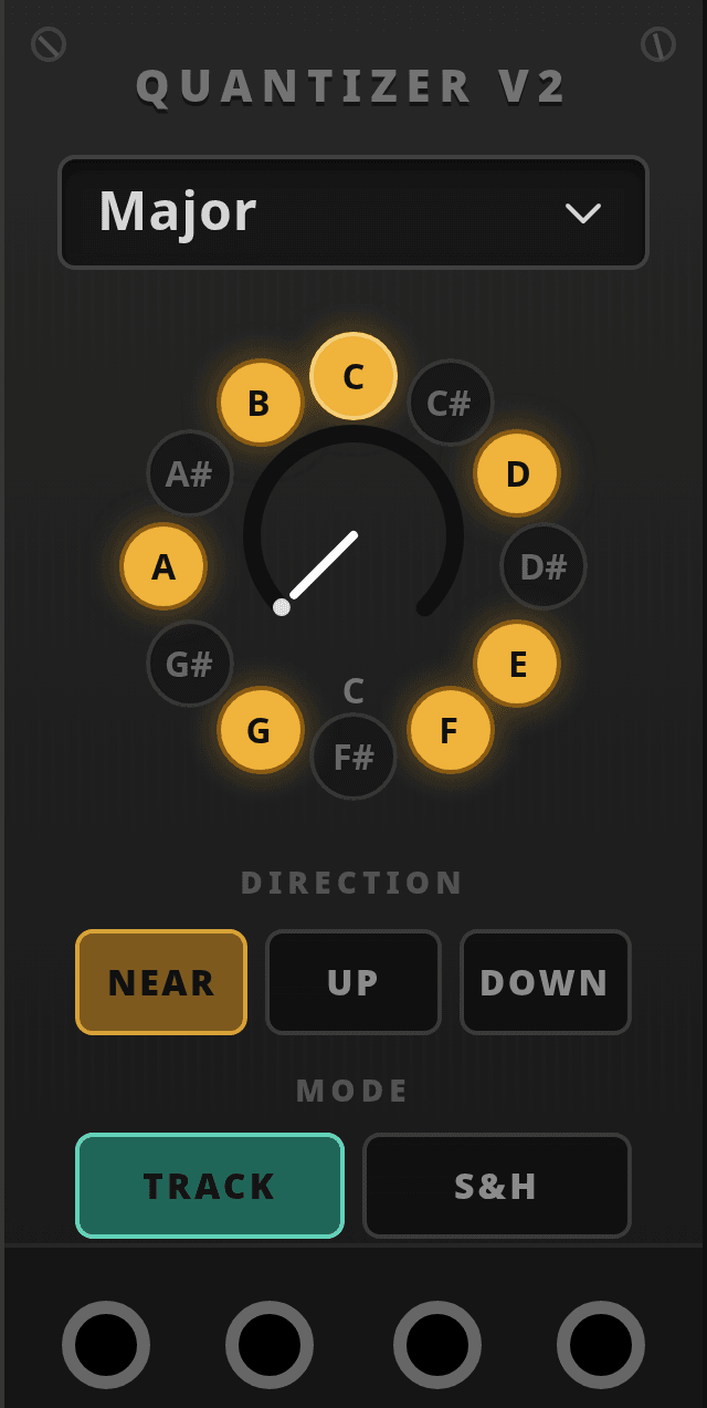 CVgoes in, quantized pitch comes out fromQuant.TRIG INcan clock sample-and-hold quantization.TRIG OUTemits a pulse when the quantized note changes.- The scale can come from a preset or from the editable 12-note mask ring.