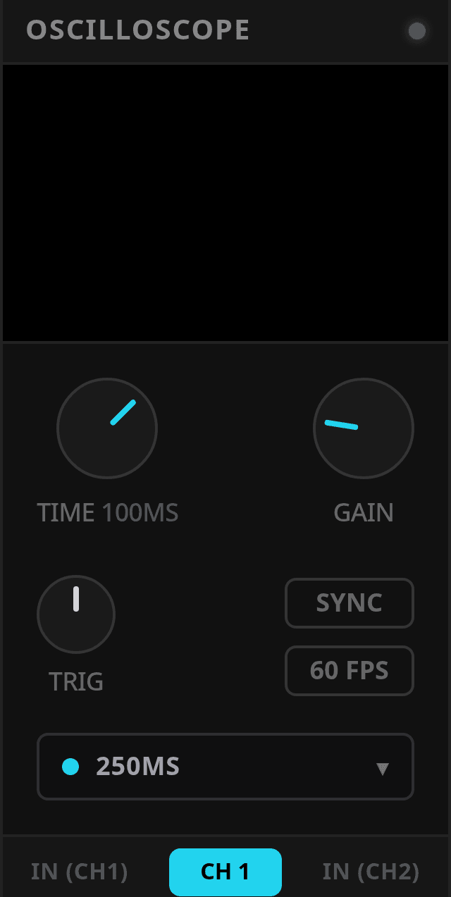 Scope is a compact two-channel oscilloscope for monitoring audio or CV, with selectable channel view, time window, gain, trigger level, sync mode, and span presets.