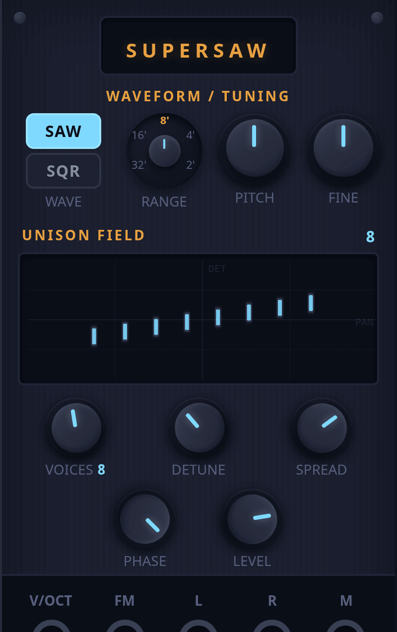 LandRare the stereo-panned unison mix.Mis the centered mono sum of the same voice stack.- Output level is normalized across the active voice count, so adding voices does not scale volume linearly.