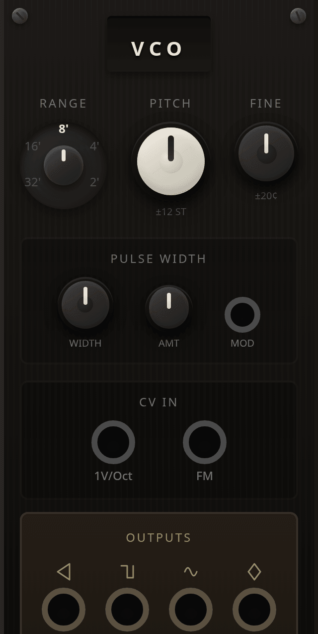 VCO is a classic four-output oscillator that generates saw, square, sine, and triangle waves at the same time, with octave range selection, tuning controls, and pulse-width modulation.