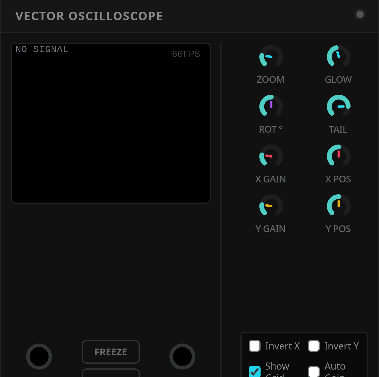Vector Oscilloscope plots two incoming signals against each other on an X/Y display, making stereo phase, Lissajous figures, and geometric waveform relationships easy to see.